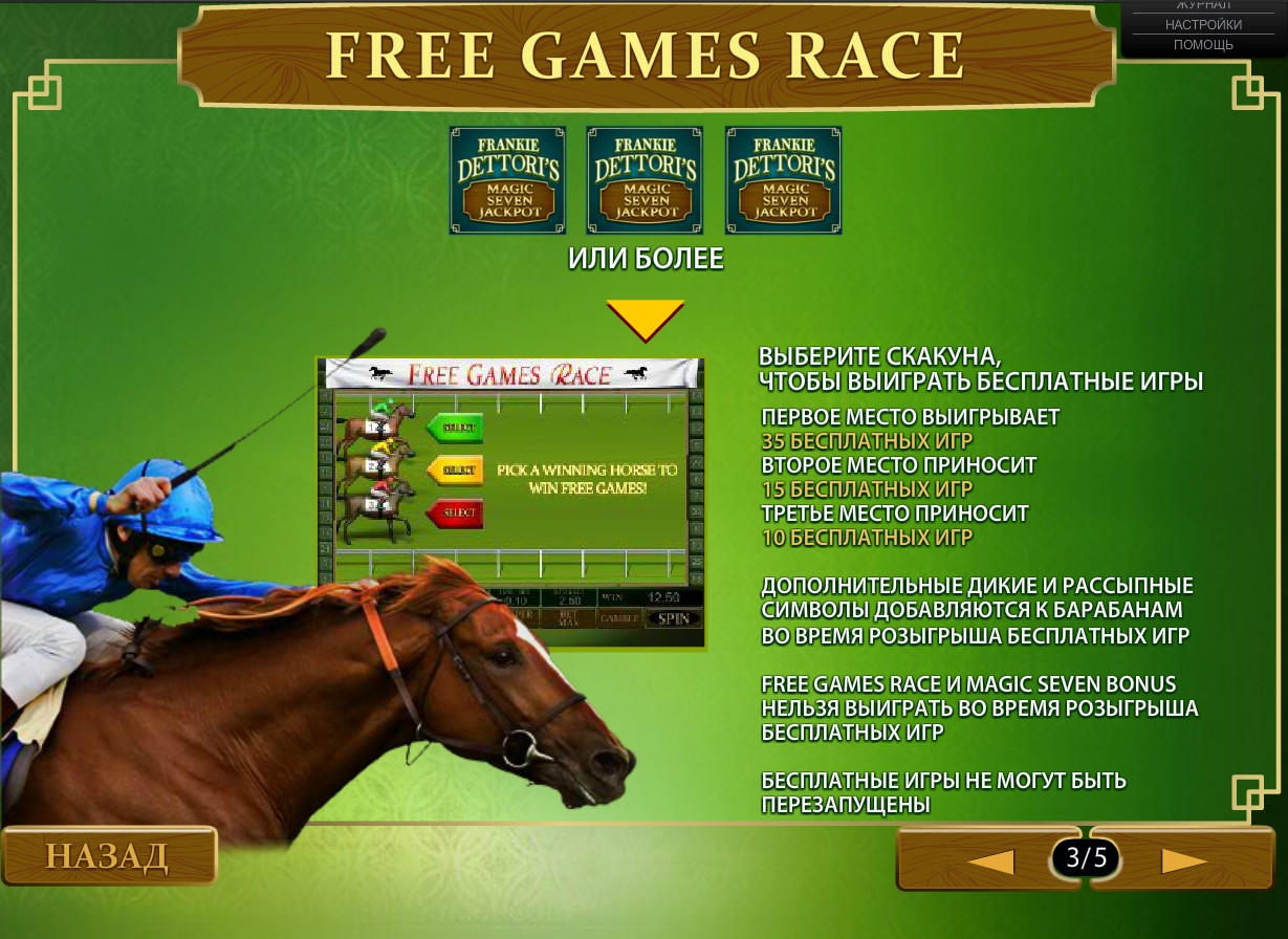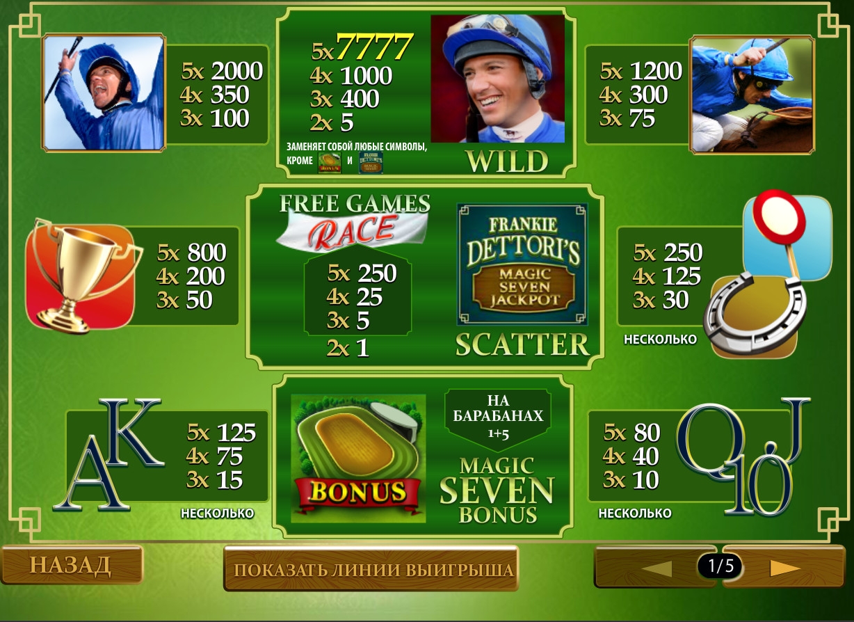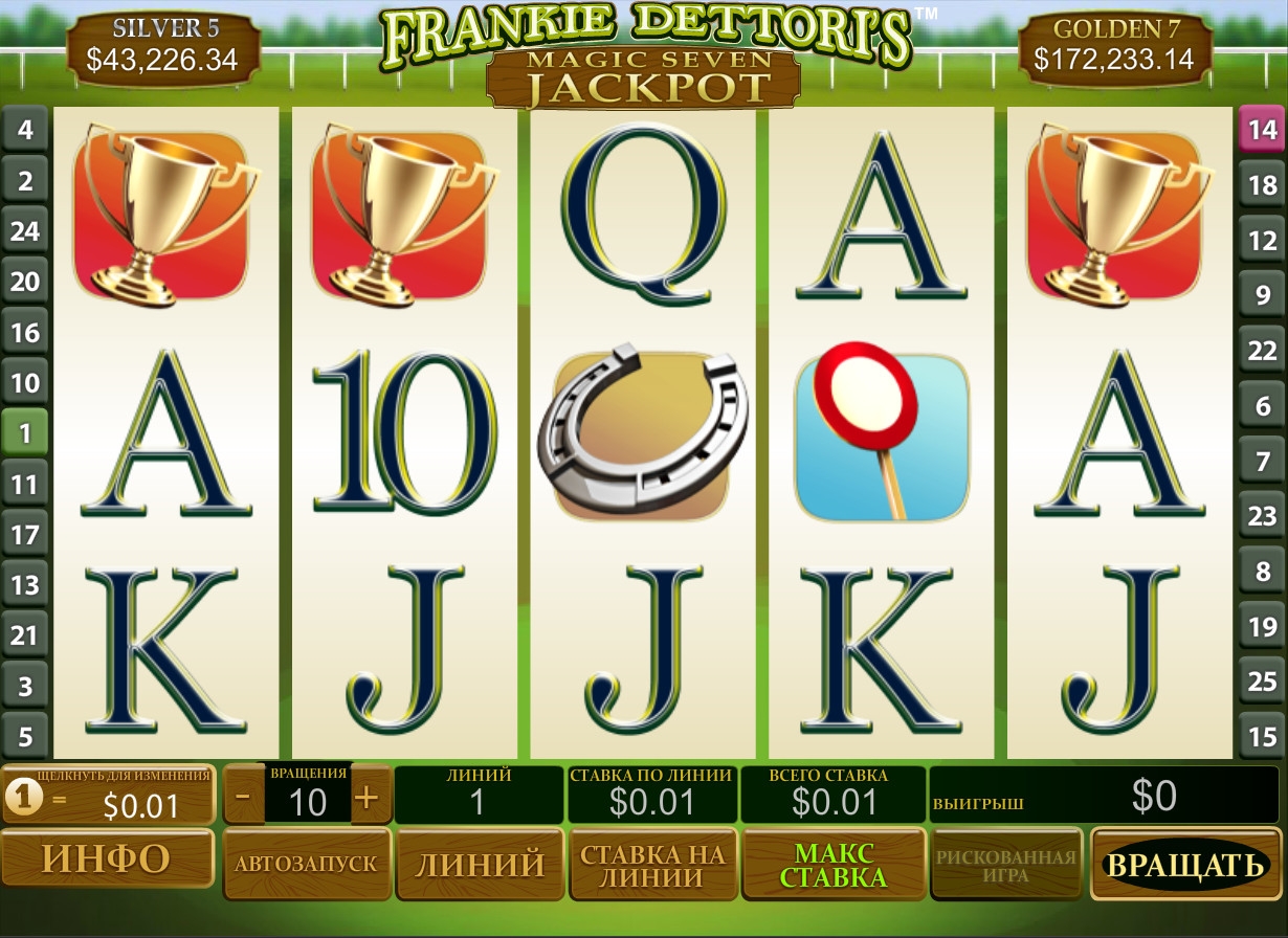 Frankie Dettori’s Magic Seven Jackpot имеет пять барабанов, двадцать пять линий и пятнадцать картинок на основном экране. В нем реализованы простые и особые картинки, бесплатные вращения, тематический призовой раунд, а также игру по шансам.