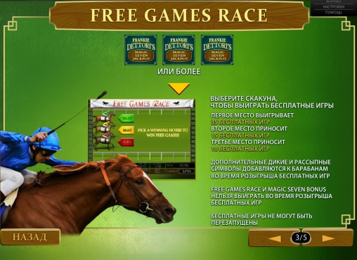 - Free Games Race – Сначала на дополнительном экране вы увидите трех наездников. Вам нужно будет выбрать одного из них перед началом гонки. В зависимости от того, какое место он займет, вам будет начислено определенное количество фри-спинов: тридцать пять за первое место, пятнадцать за второе и десять за третье. Далее начнутся бесплатные вращения по ставке и количеству линий из последнего спина. Деньги за вас будет ставить казино. Продлить вращения нельзя.