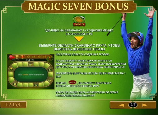 - Magic Seven Bonus – Этот раунд тоже начинается на отдельном экране. Вы увидите ипподром, трек которого будет разбит на сектора. Вы будете выбирать их в случайном порядке, получая множители. Так нужно будет продолжать, пока не выпадет слово «Получить», завершающее розыгрыш. Далее накопленные мультипликаторы будут умножены на ставку из последнего спина для расчета итогового выигрыша.