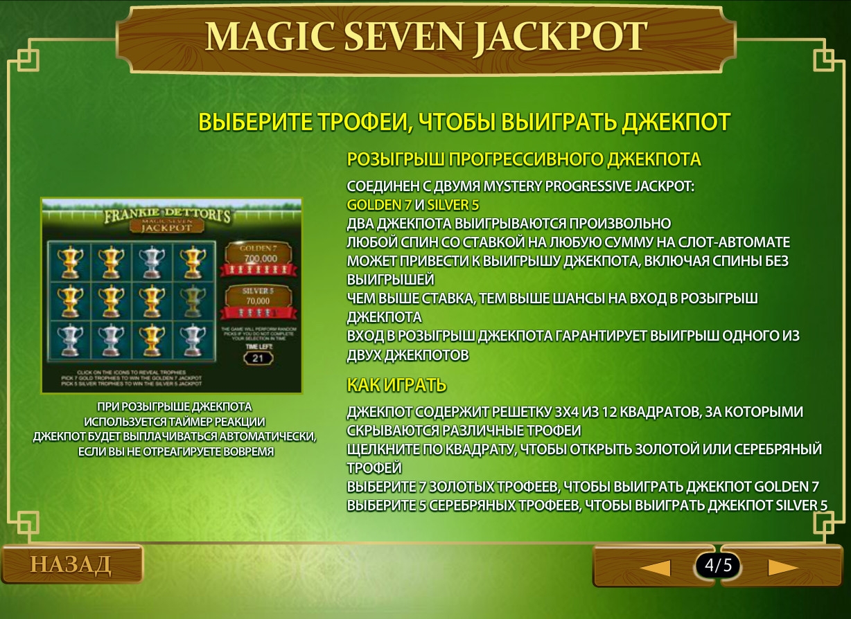 В видео-слоте Frankie Dettori’s Magic Seven Jackpot разыгрываются два отдельных прогрессивных джекпота: Golden 7 и Silver 5. Они накапливаются путем отчислений 0.99% все ставок настоящими деньгами. Стартовые суммы джекпотов равны 70 000 и 7 000 евро соответственно.