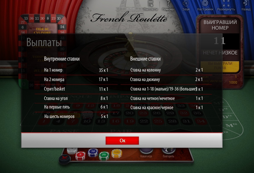 В French Roulette действует правило, согласно которому при выпадении зеро пользователю возвращается половина внешних ставок, проигрывающих в данном случае. Напомним, что именно оно делает французскую рулетку более выгодной в сравнении с другими версиями.