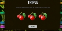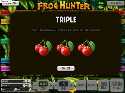 Общий выигрыш, полученный за спин в Frog Hunter, можно попытаться удвоить или утроить в рискованной игре по шансам. Здесь нужно будет выбрать одну из предложенных вишенок. Соответственно, в игре на удвоение шансы на победу 1:2, а в раунде на утроение они составляют 1:3. Количество удачных попыток в одном подходе может ограничиваться правилами казино.