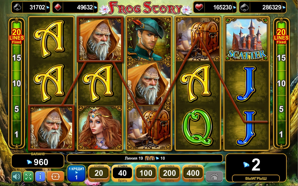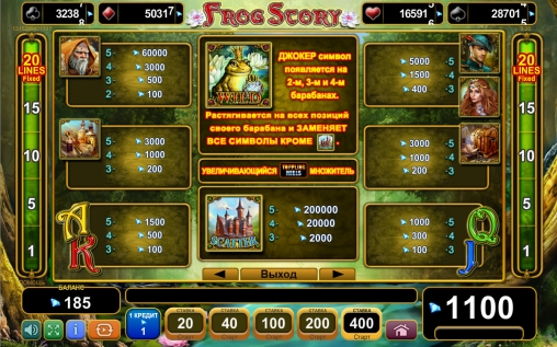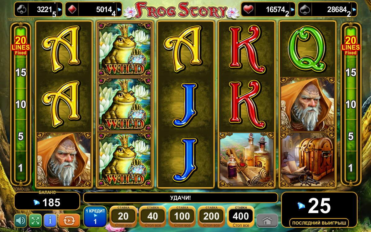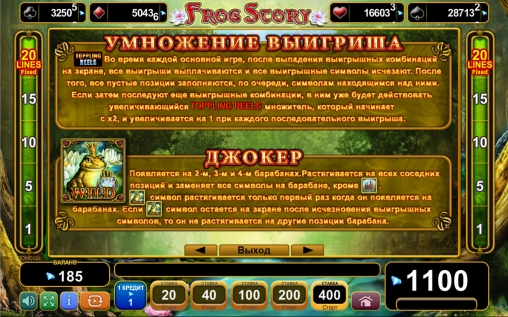 «Сказка о лягушке» является пятибарабанным слотом с пятнадцатью символами на основном экране. Играть можно лишь по двадцати фиксированным линиям, сделав по ним равные ставки. На каждую полосу принимается одна, две, пять, десять или двадцать монет. Диапазон их номиналов определяется правилами заведения, которому вы отдадите предпочтение.