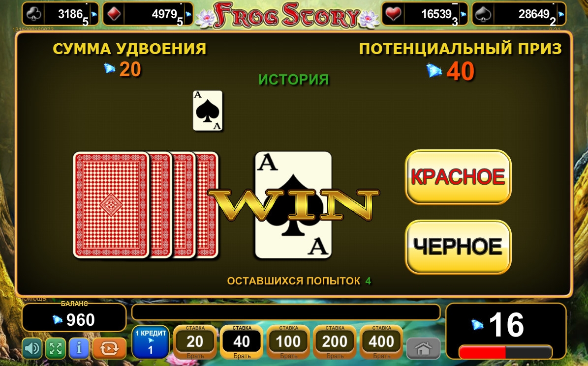 В Frog Story предусмотрен розыгрыш четырех накопительных джекпотов, названных по мастям карт. Они увеличиваются благодаря отчислениям из ставок клиентов, сделанных настоящими деньгами.