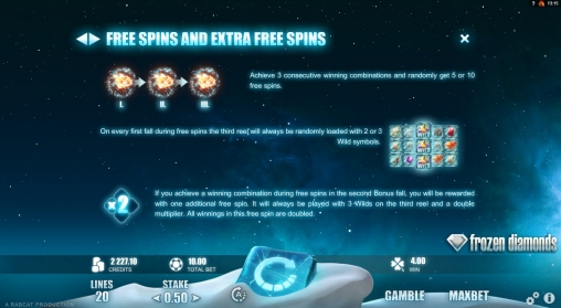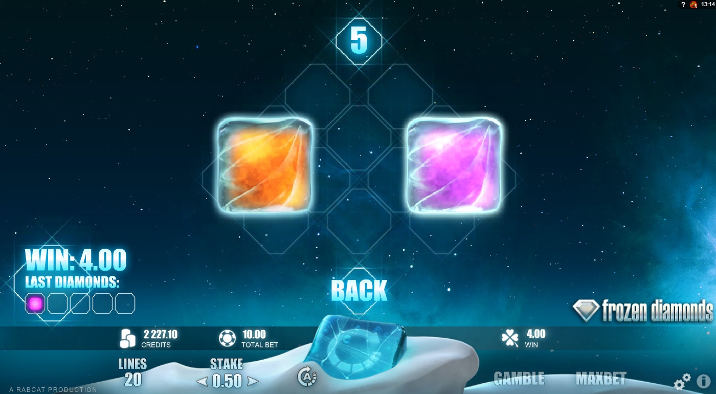 Все начисленные кредиты можно сразу не выводить, а ставить в игре по равным шансам. Здесь нужно выбрать одну из двух сияющих ледышек, которая сразу же лопнет. Если на ее месте окажется бриллиант, выплата удвоится. Иначе вы проиграете ставку. Подряд можно действовать до пяти раз.