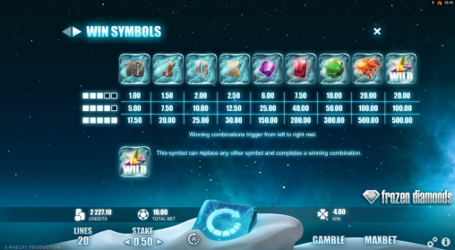 «Замерзшие бриллианты» - это видео-слот с пятью барабанами, тремя рядами картинок на экране и двадцатью фиксированными линиями.