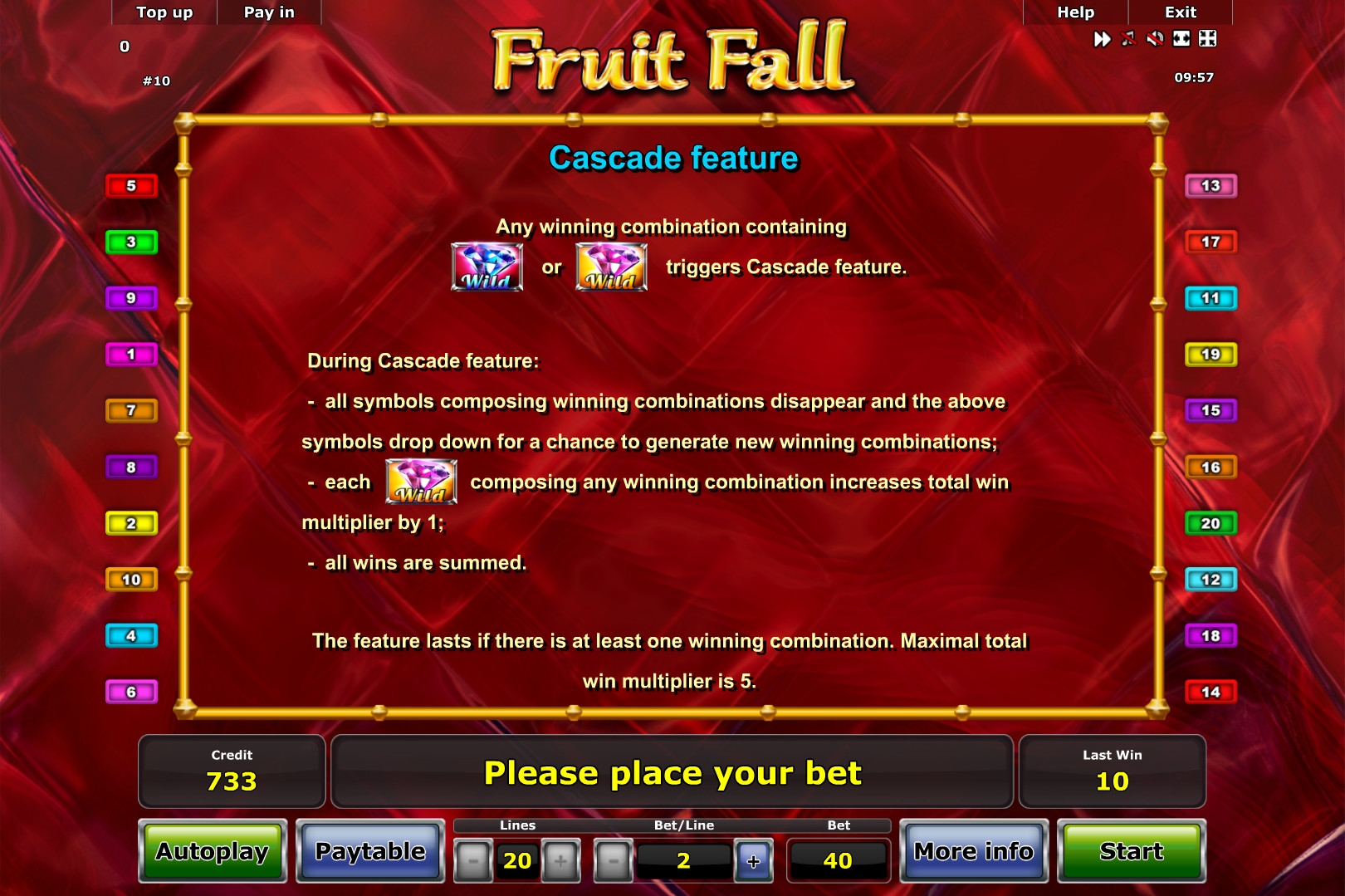 «Падение фруктов» представляет собой онлайновый игровой автомат с двадцатью постоянно задействованными линиями и двадцатью картинками на основном экране. Они располагаются по схеме 5х4.