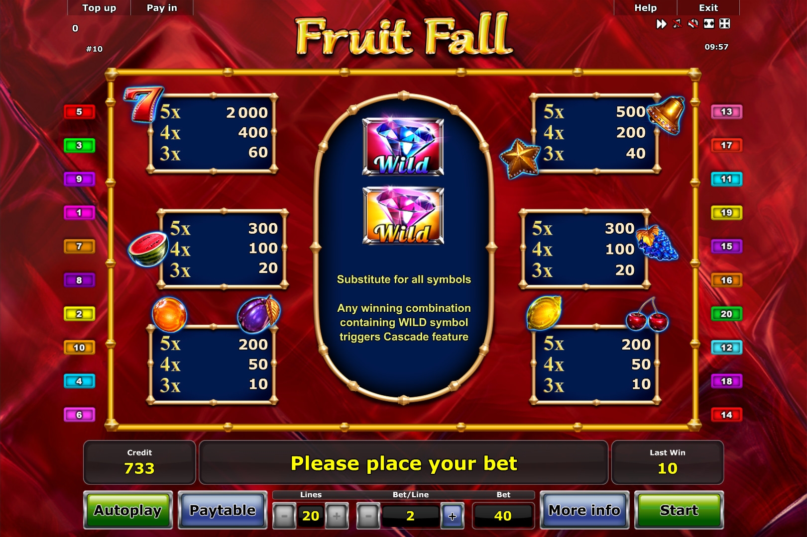 Вы найдете Fruit Fall в различных интернет-казино на лицензионном программном обеспечении Novomatic. Например, его можно протестировать бесплатно или делать ставки настоящими деньгами в StarGames.