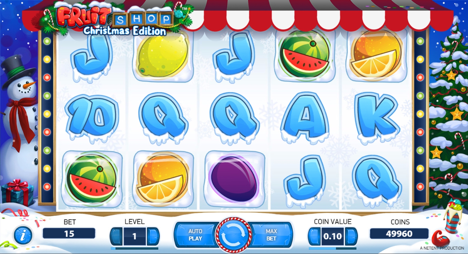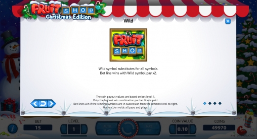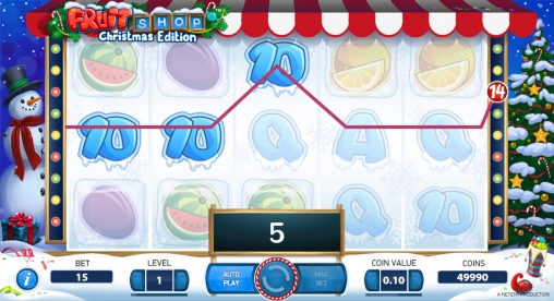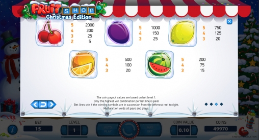 Fruit Shop: Christmas Edition имеет пять барабанов и пятнадцать постоянно задействованных полос для образования на них комбинаций из одинаковых картинок. По каждой позиции можно ставить до десяти монет достоинством 0.01, 0.02, 0.05, 0.10, 0.20, 0.50 или 1 евро. Получается, что на раунд принимается не менее пятнадцати центов и не более ста пятидесяти евро.