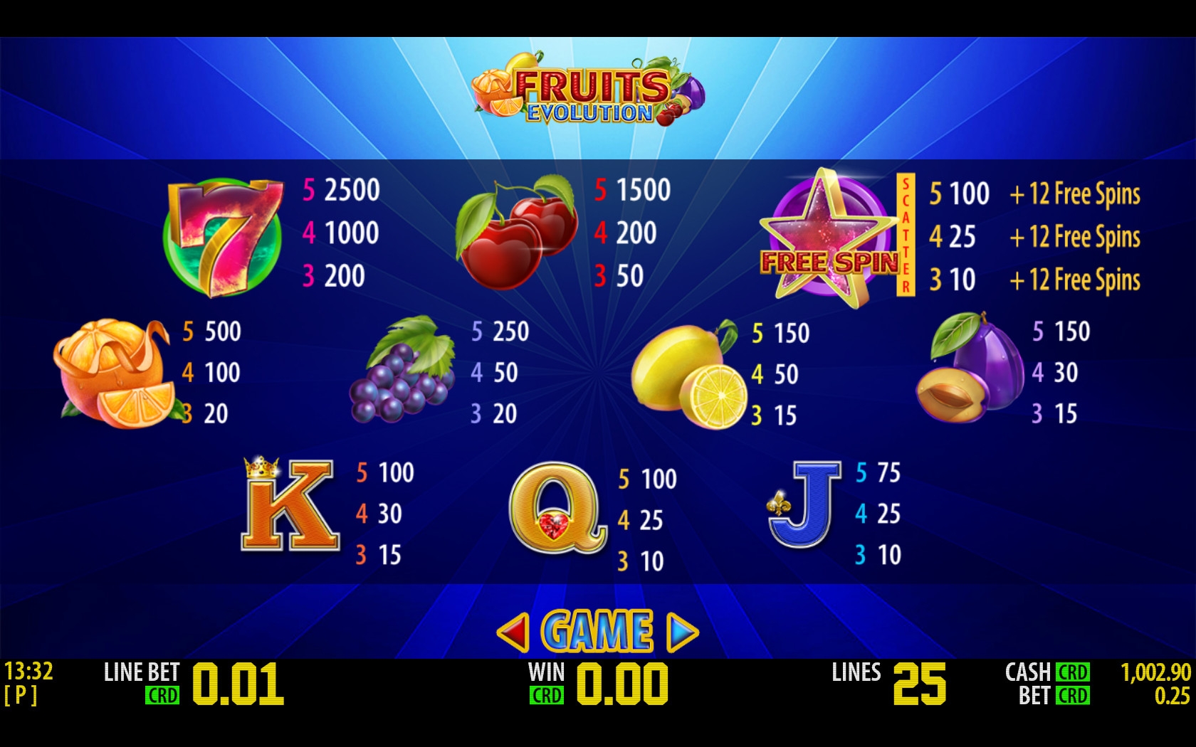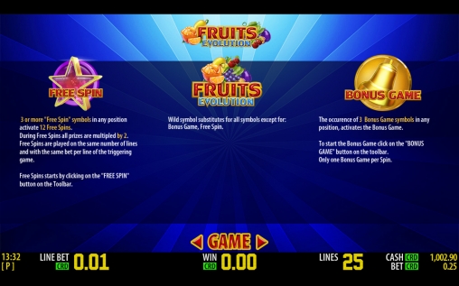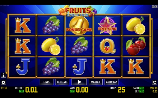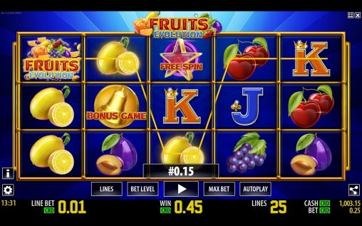 Fruits Evolution имеет пять барабанов, пятнадцать картинок на основном экране и двадцать пять линий. Набор опций геймплея состоит из простых и особых символов, бесплатных символов с удвоенными выплатами и бонусной игры.