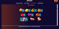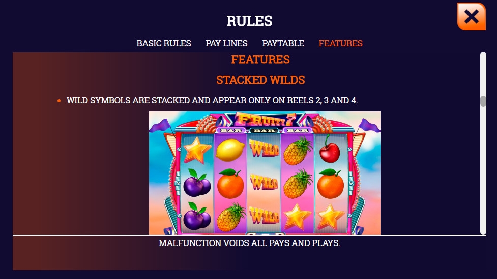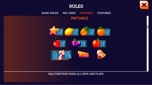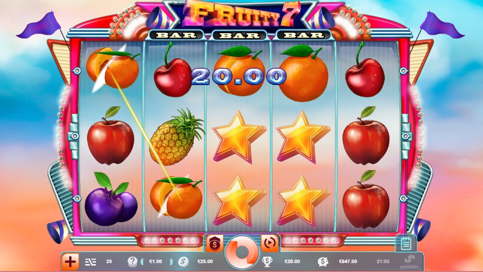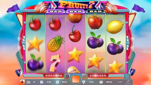 В онлайн-автомате Fruity 7 пять вращающихся барабанов. В каждой колонке появляются на экране по три картинки. Они составляют комбинации на двадцати пяти постоянно активных линиях и запускают бонусные функции.