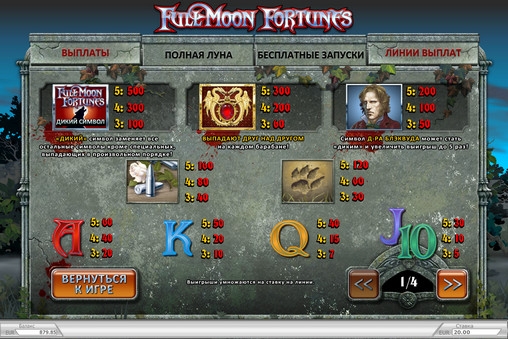 Видео-слот Full Moon Fortunes полностью переведен на русский язык, включая не только надписи на экране, но также все диалоговые окна, таблицу выплат и справочный раздел с правилами игры. Это означает, что знакомиться с интерфейсом модели вам будет очень легко. К тому же, он интуитивно понятен и очень прост.