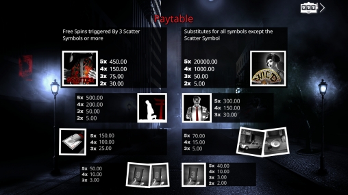 Необычные игральные карты, вооруженный полицейский, силуэт человека на коленях, автомобиль, суши, чек – эти и другие тематические картинки вы увидите на экране видео-слота. Все они изображены в черно-белых тонах с яркими вкраплениями красных и желтых элементов.