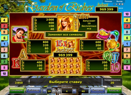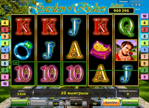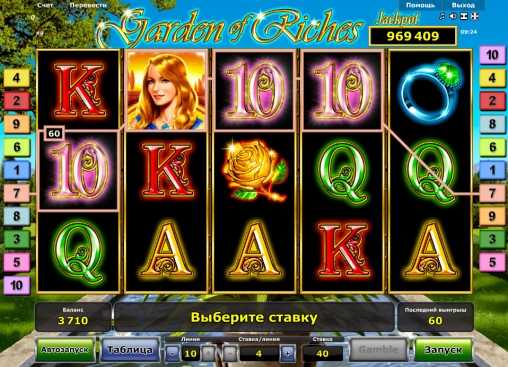 На барабанах игрового автомата «Сад богатств» можно увидеть парня, девушку, перстень, диадему, желтую розу и разноцветные номиналы игральных карт от десятки до туза.