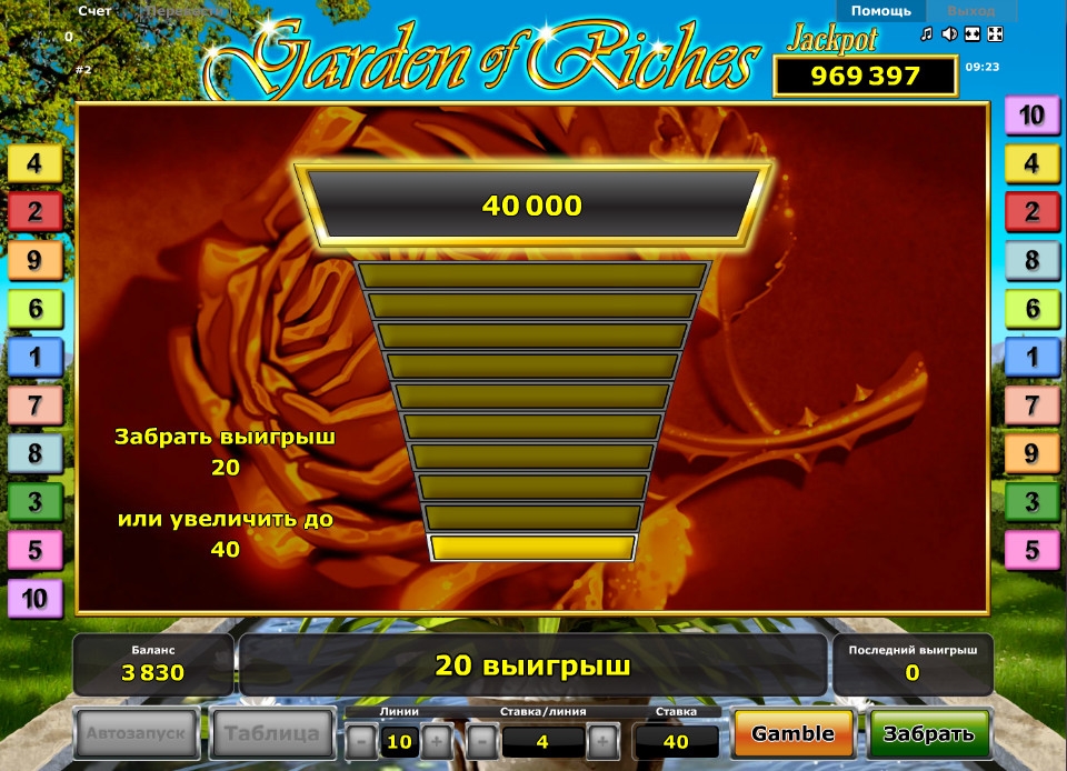 Garden of Riches – 5-барабанный слот с десятью линиями и тремя рядами символов. В нем есть особые символы, накопительный джекпот, игра по шансам и призовые спины. Все функции подробно объясняются в статье.