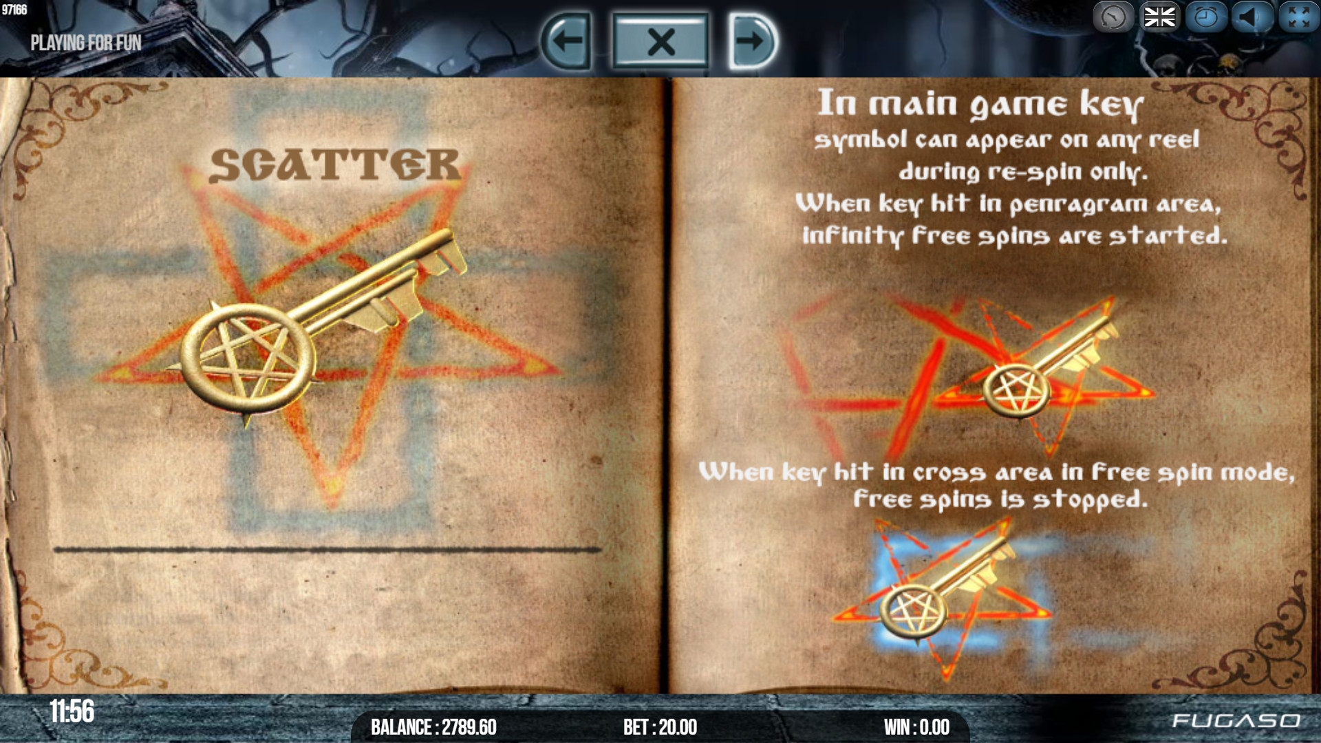 - Scatter (ключ) появляется только в течение респинов, выпадая в любых барабанах. Если он оказывается в зоне, выделенной пентаграммой, запускаются Infinity free spins.