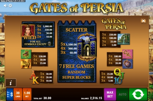 Играть на пятибарабанном игровом автомате «Врата Персии» можно по десяти, двадцати или тридцати активным полосам. На них разрешается делать только равные ставки в диапазон от одного цента до двух долларов на каждую. Выходит, что на раунд принимается не менее десяти центов и не более шестидесяти долларов.