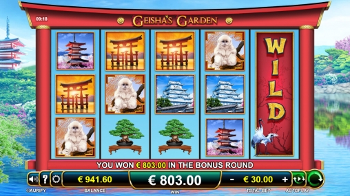 На экране видео-слота «Сад гейши» появляется главная героиня, самурай в доспехах, животные, традиционные японские строения, вазы и деревце бонсай.