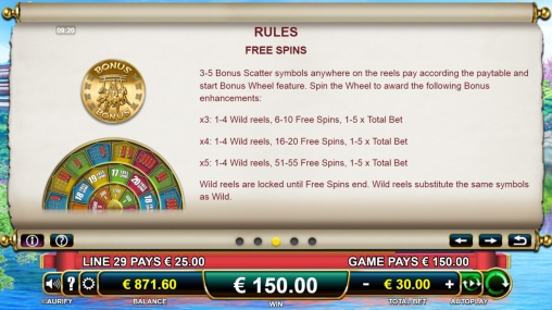 - Free Spins – Перед началом бесплатных розыгрышей нужно раскрутить колесо фортуны. Оно состоит из трех барабанов, вращающихся внутри друг друга. Внешний определяет количество Wild Reels (от одного до четырех), средний указывает число фри-спинов, а внутренний приносит мгновенную выплату в размере от одной до пяти общих ставок. Запусков может быть от шести до пятидесяти пяти. Диапазон зависит от числа скаттеров, начавших раунд. Далее идут бонусные вращения на деньги казино. В них минимум один барабан всегда занят джокером.
