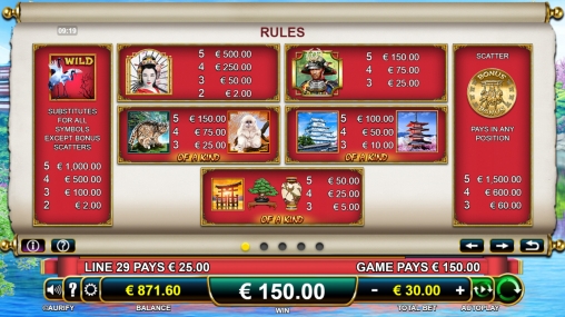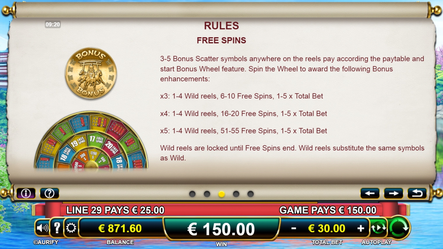 Видео-слот «Сад гейши» имеет пять барабанов, тридцать фиксированных полос для комбинаций и пятнадцать позиций для иконок на центральном экране.