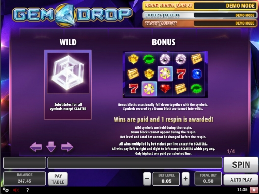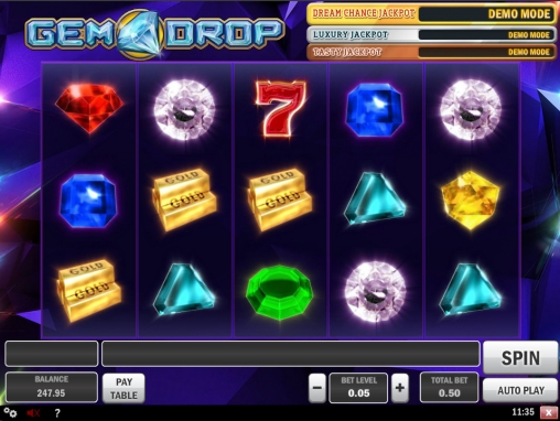 Gem Drop представляет собой онлайновую слот-машину с пятью барабанами, десятью линиями и пятнадцатью картинками на основном экране. Набор доступных функций состоит из простых и специальных картинок, джекпотов, риск-игры и бонусных респинов, действующих по особым правилам.