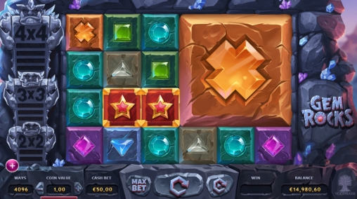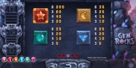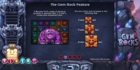 В игровом автомате Gem Rocks шесть барабанов, хотя визуально они не похожи на вращающиеся барабаны. Речь идет о шести колонках, заполняющихся падающими камнями. Символы располагаются в четыре ряда.