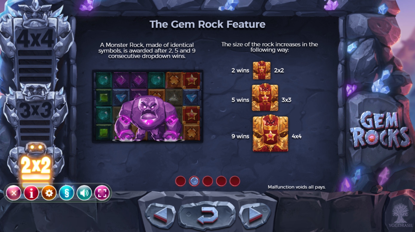 - The Gem Rock Feature – После двух, пяти и девяти последовательных запусков Dropdown Wins на экране появляется Monster Rock. Это чудовище, напоминающее голема из камней. В первом случае он превращается в кластер из четырех одинаковых картинок (2х2). Во втором он занимает девять ячеек (3х3). А в третьем он заполняет шестнадцать (4х4) позиций символами одного типа. Текущий размер отображается на шкале, расположенной слева от колонок.