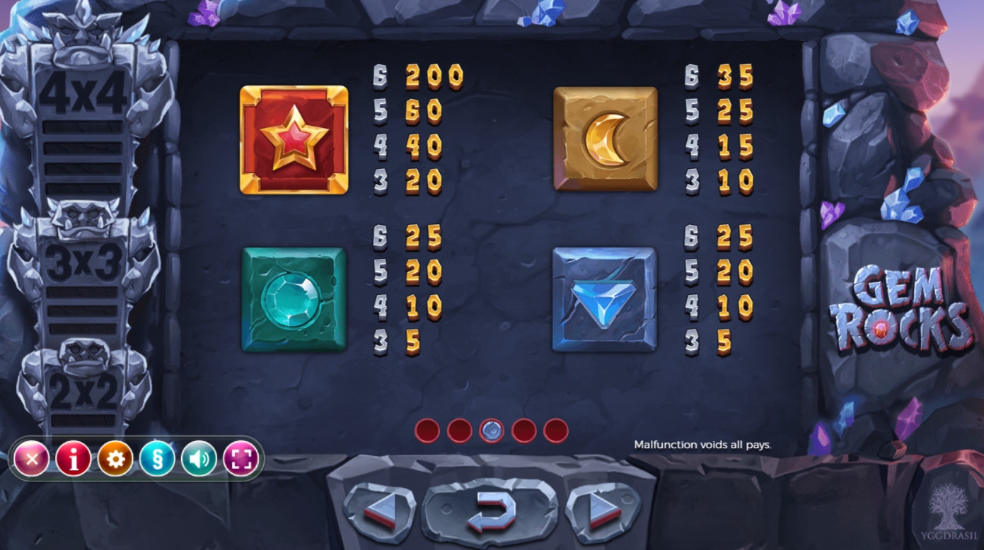 Испытать Gem Rocks бесплатно можно на Casinoz. Рискнуть настоящими деньгами на автомате предлагают онлайн-казино, сотрудничающие с Yggdrasil.
