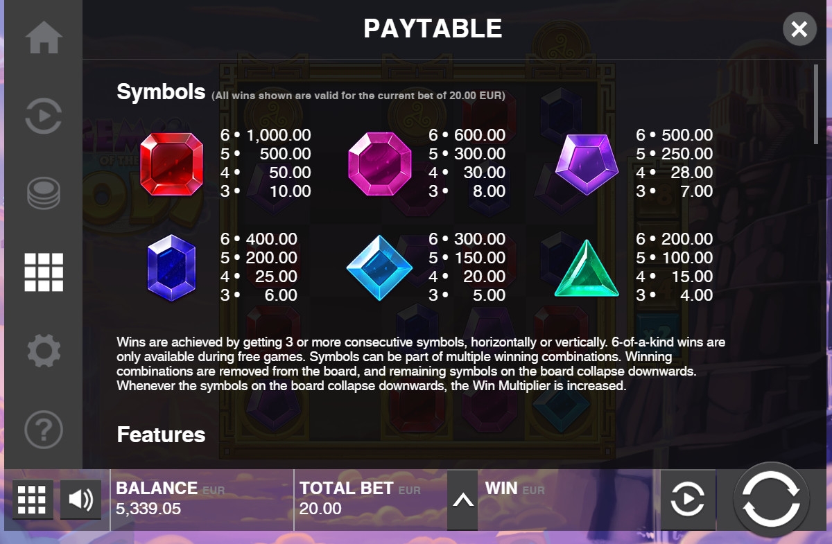 Если в результате падения камней формируется новая комбинация, выплата по ней рассчитывается с учетом дополнительного множителя. Сначала он равен х2, затем х4, х6 и х8. Так продолжается, пока образуются выигрышные цепочки. По завершению раунда деньги выводятся на счет.
