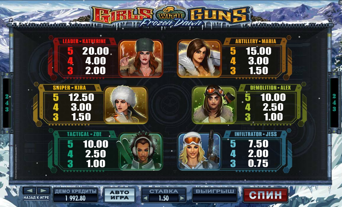 Girls with Guns II – Frozen Dawn – пятибарабанная модель с тремя рядами картинок на экране, особыми символами, призовыми раундами, бесплатными спинами и другими функциями, которые рассматриваются ниже в обзоре.