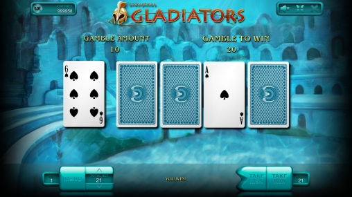 В видео-слоте «Гладиаторы» есть раунд на удвоение, который запускается на отдельном экране. Здесь вы увидите одну открытую карту и четыре закрытых, из которых нужно перевернуть любую, на ваш выбор. Если она будет старше карты дилера, выплата увеличится в два раза. Если младше, вы лишитесь ставки. При равном достоинстве карт объявляется ничья. Играть можно несколько раз подряд.