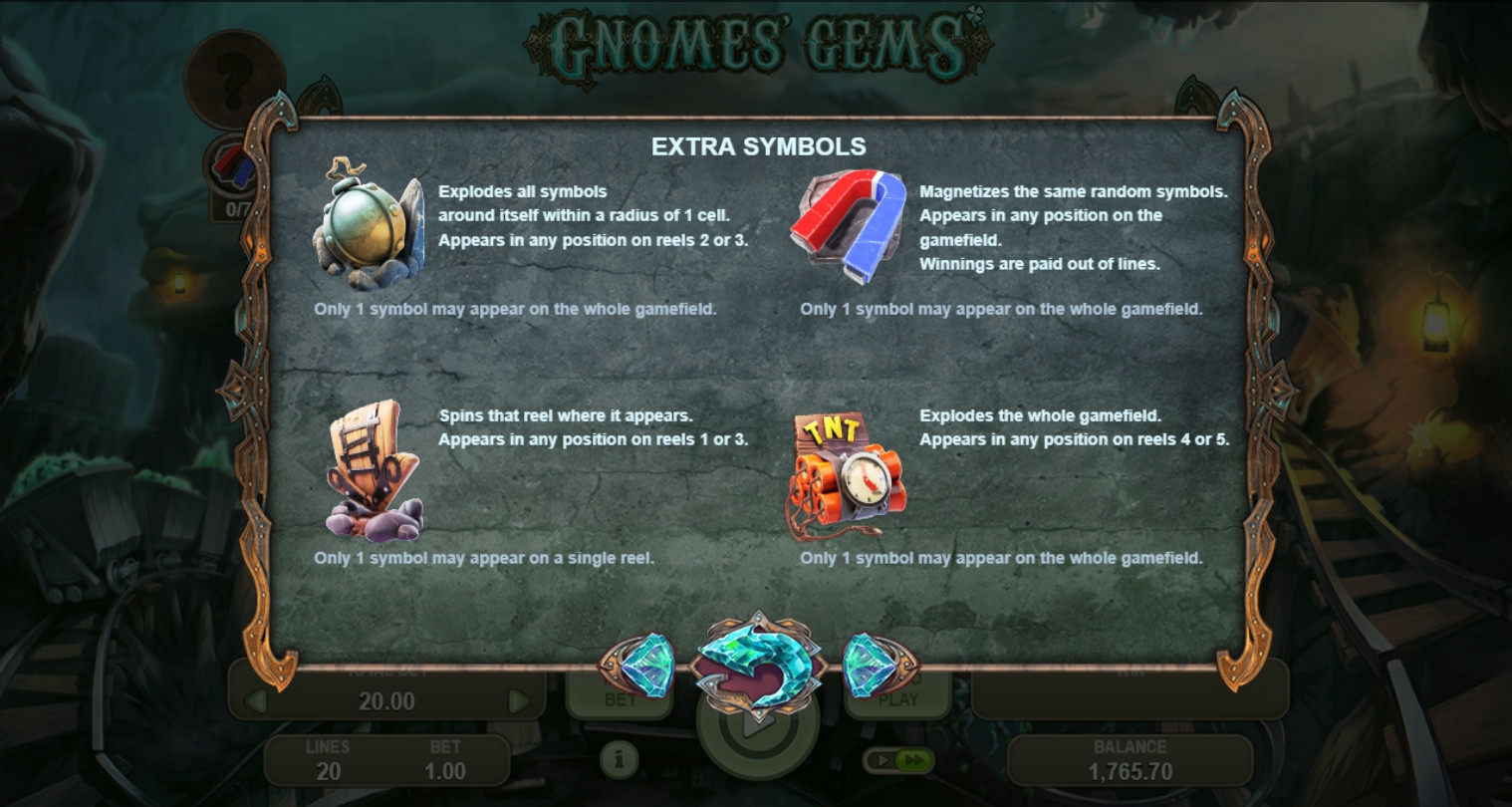 Рассмотрим особенности призовых функций слота Gnomes’ Gems. Сначала обсудим возможности символов Extra: