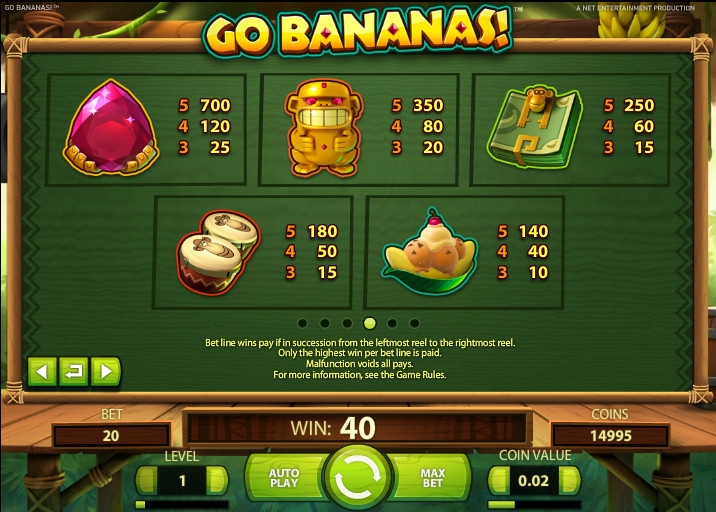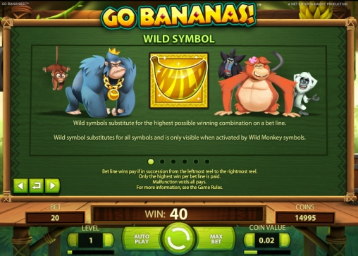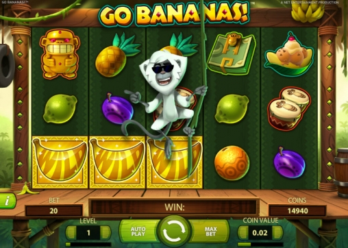 Неформальное выражение go bananas в английском языке означает «рехнуться», или «спятить», так что название видео-слота, которому посвящен наш обзор, можно воспринять как призыв позволить себе немного «сорваться с катушек» и оторваться по полной. Тем более что компанию вам составят безумные обезьянки из южноамериканских джунглей. Выпустила бесплатный игровой автомат Go Bananas известная компания Net Entertainment, поэтому вы можете не сомневаться в превосходном качестве данной модели.