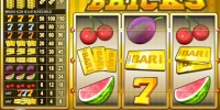 золотых слитка c надписью BAR, семерки трех цветов, вишни и ломти арбуза.