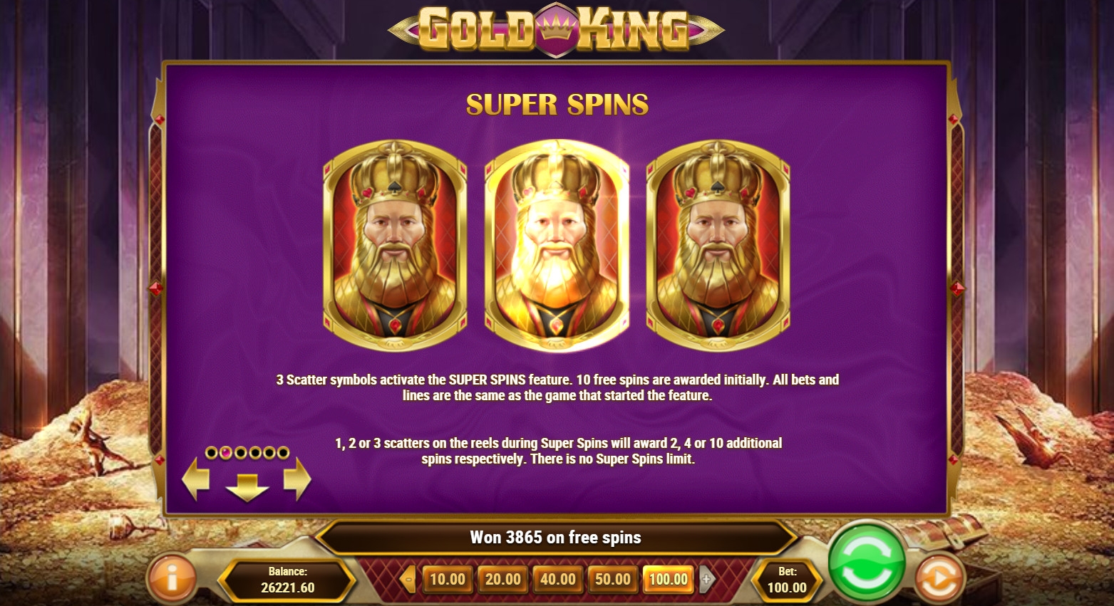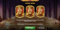 - Super Spins – Три скаттера дают старт десяти бесплатным вращениям. Они проходят на кредиты онлайн-казино по прежней ставке. В течение фри-спинов джокер идет стеками по шесть-семь картинок. Слитки, кулон и корона расширяются, заполняя колонки. Карточные номиналы появляются вертикальными цепочками по восемь элементов. Один, два или три короля продлевают раунд на два, четыре или десять спинов соответственно. Максимальное количество вращений не ограничено.