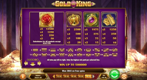 В видео-слоте Gold King пять барабанов, двадцать фиксированных линий и пятнадцать ячеек для символов на центральном экране.