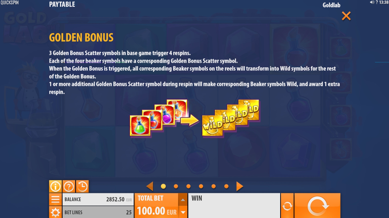 - Scatter (золотые изображения колбочек с растворами) выпадает в первой, третьей и пятой колонках. Когда он оказывается сразу на трех барабанах, он запускает четыре бесплатных респина.