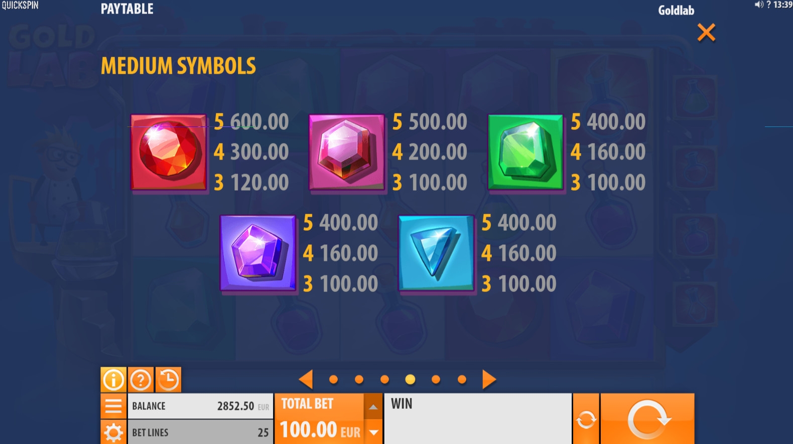 «Лаборатория золота» - бесплатный игровой аппарат с пятью барабанами и двадцатью пятью фиксированными линиями, предназначенными для формирования на них оплачиваемых последовательностей. Картинок на экране помещается одновременно пятнадцать.