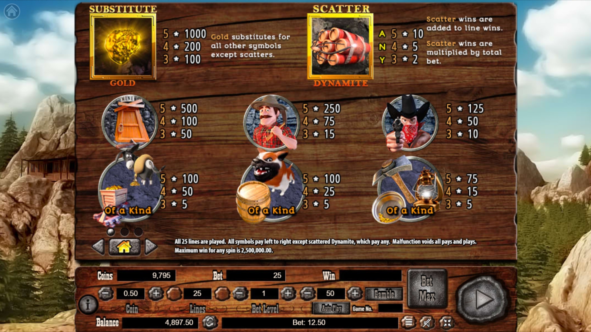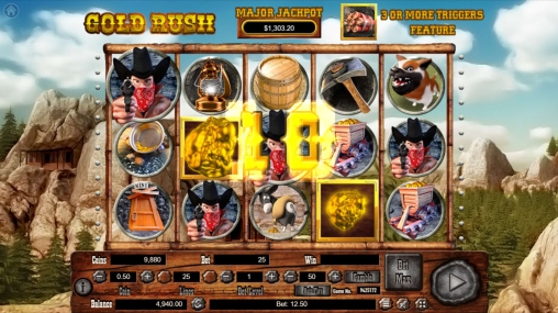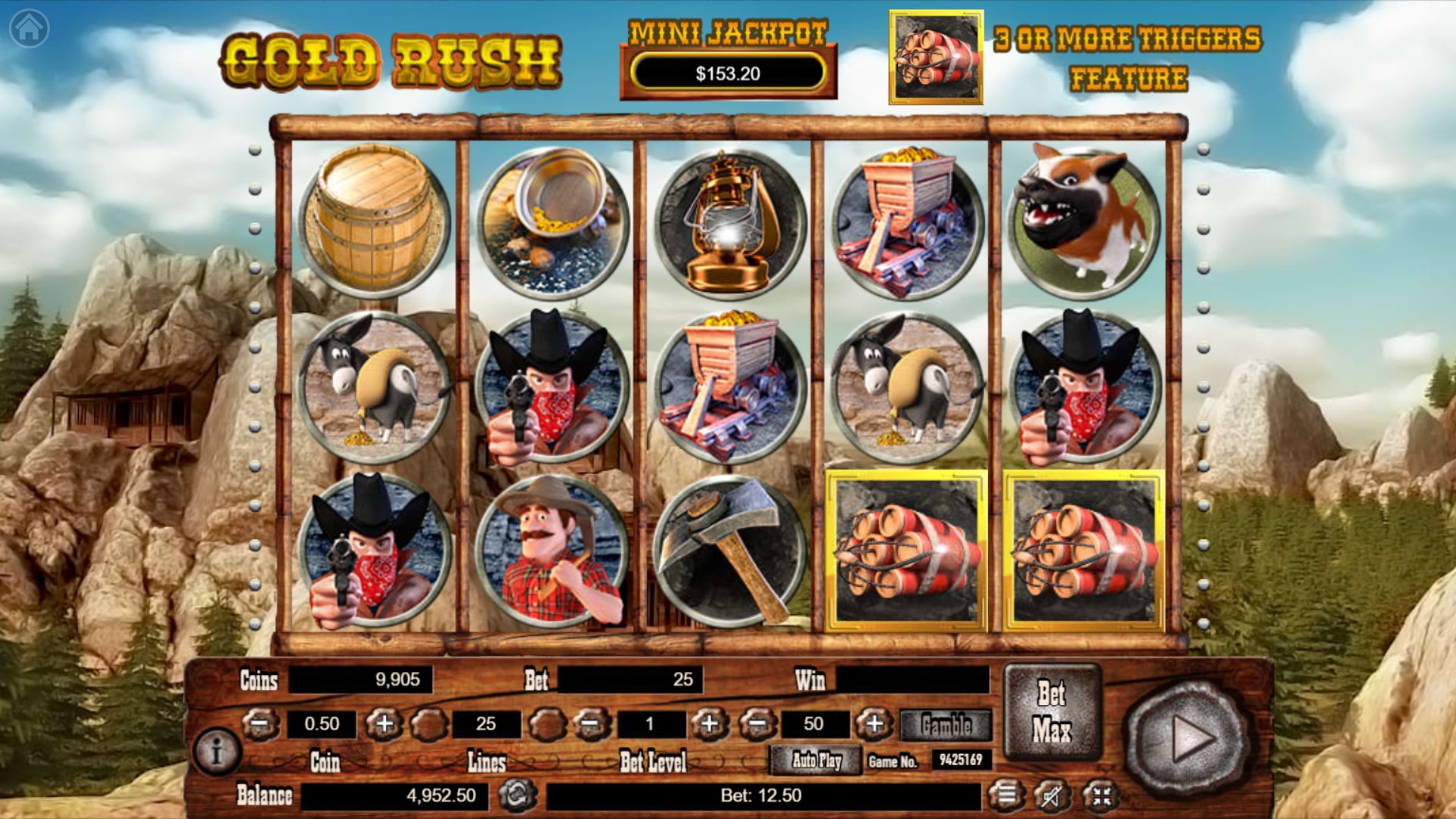 Видео-слот Gold Rush имеет пять барабанов, двадцать пять фиксированных полос и пятнадцать картинок на экране, выстраивающихся в три ряда.