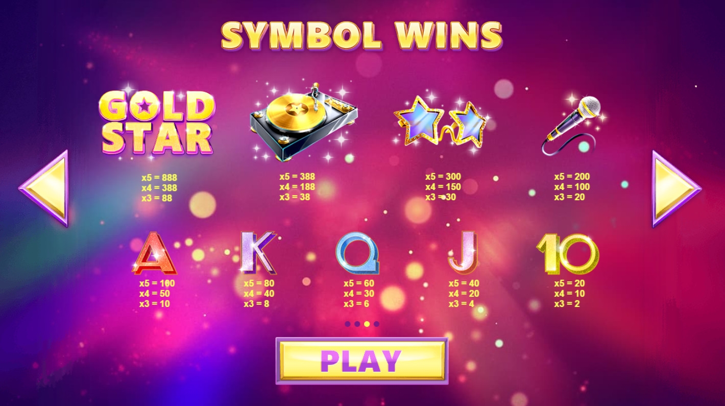 Кроме стандартных номиналов игральных карт, на барабанах автомата представлены очки в виде звездочек, микрофон, проигрыватель виниловых пластинок и логотип Gold Star. Все они появляются в колонках длинными стеками, что позволяет им занимать столбцы сверху донизу.