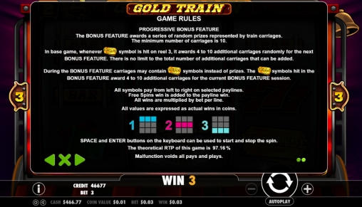 - Progressive Bonus Feature – На дополнительном экране появится поезд, тянущий за собой вагонетки с золотом. Они будут приносить вам разные выплаты. Кроме того, в них могут быть золотые билеты, удлиняющие состав на четыре – десять вагонеток.