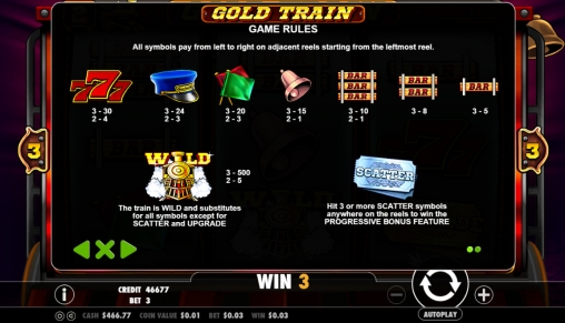 - Wild (паровоз) выпадает по всех колонках и может сам формировать выигрышные цепочки. Они оплачиваются по максимальным коэффициентам. Он также является джокером, способным заменять другие элементы, кроме Scatter и Upgrade.