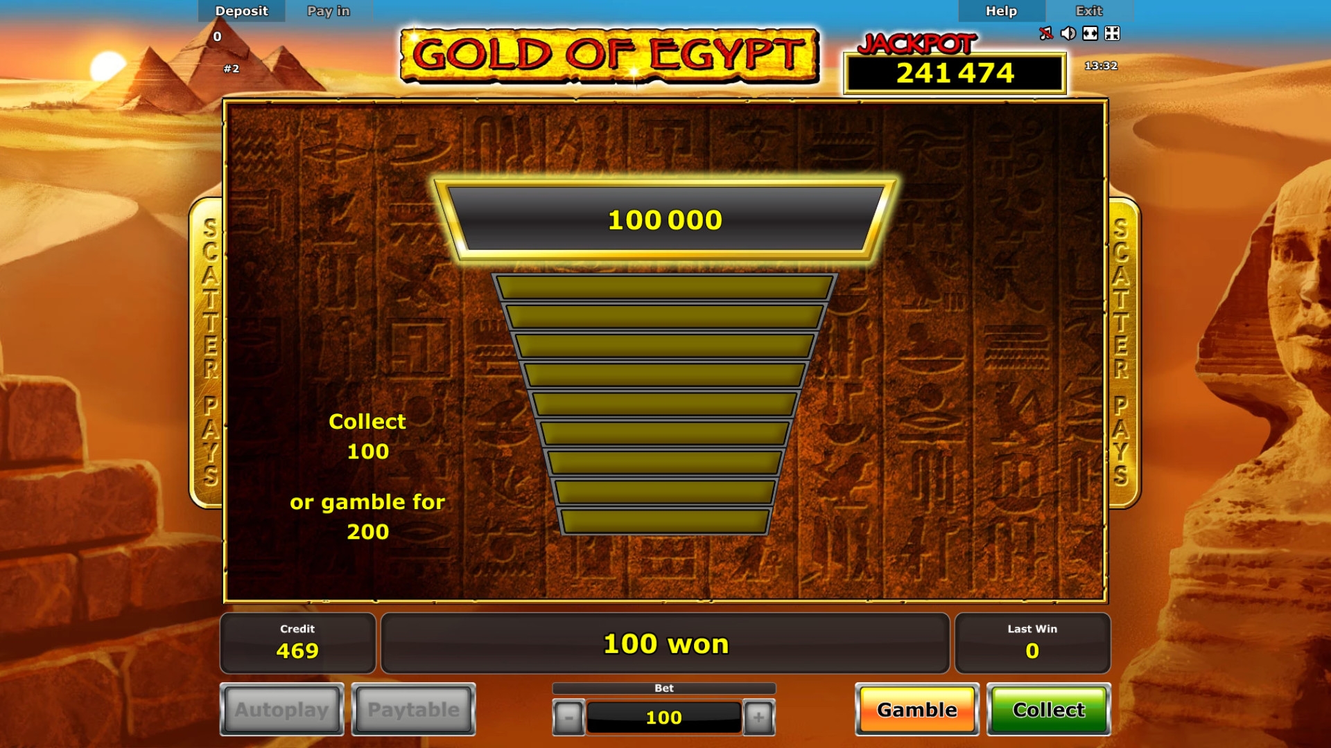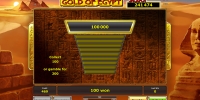 Помимо вышеупомянутых символов, игровой автомат Gold of Egypt предлагает накопительные джекпоты, риск-игру по равным шансам и фри-спины с дополнительными функциями.