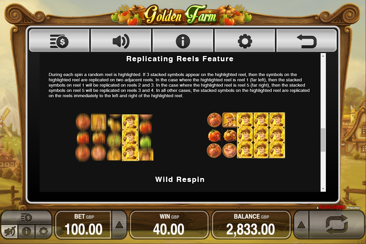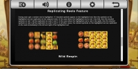 Тематического призового раунда нет, но есть вышеупомянутая функция Replicating Reels. В каждом спине один из барабанов подсвечен. Если эту колонку по завершению вращения полностью заполняют одинаковые картинки, они дублируются на соседние позиции по горизонтали. Таким образом, если, например, в третьей колонке все ячейки будут заняты изображением фермера, эти же символы растянутся на вторую и четвертую колонку.