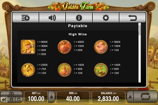 В особенностях таблицы выплат вы разберетесь самостоятельно. В параметрах можно отрегулировать звук, экран и другие опции. Скачивать Golden Farm не придется. Есть режим автоматической игры с дополнительными настройками.