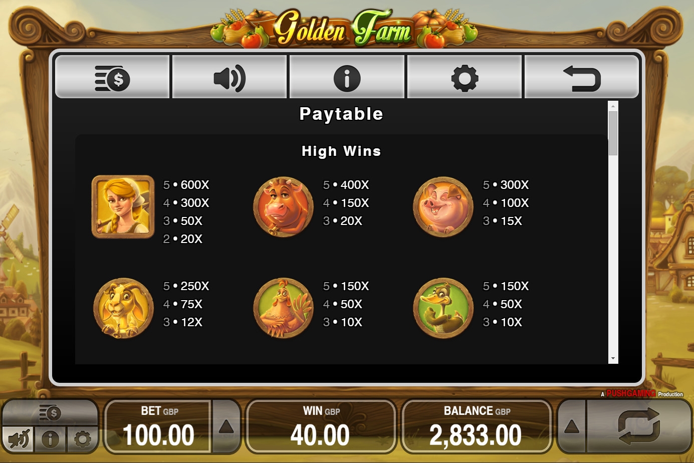 Наши обозреватели испытывали Golden Farm без регистрации в демо-версии на портале Unibet. Вы также найдете новинку в других онлайн-казино, работающих с программным обеспечением Push Gaming.