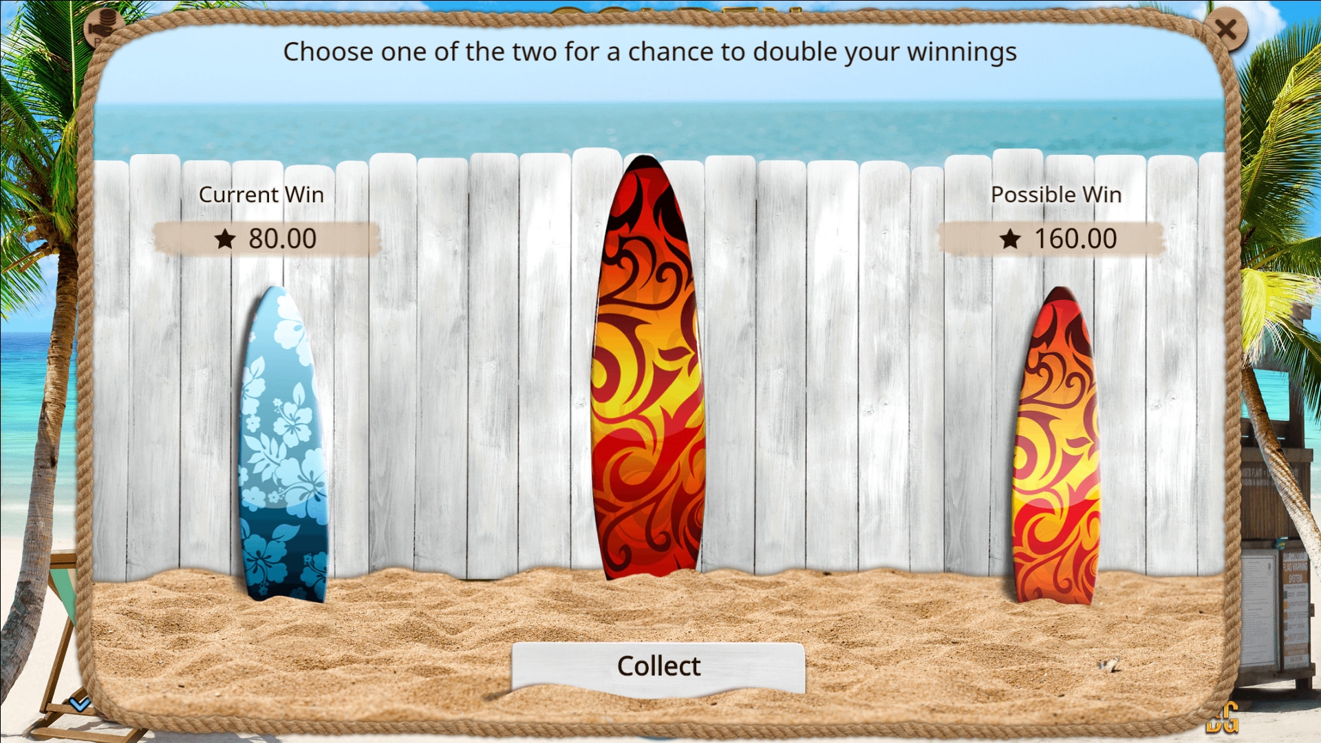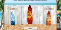 Выплату можно сразу вывести на счет или попытаться увеличить сумму в игре по равным шансам. Она проходит на дополнительном экране. Вы увидите доску для серфинга и должны будете угадать ее цвет. Получится – выигрыш удвоится, не получится – вы лишитесь денег. Вероятность победы – 50%. О лимитах читайте в справке.