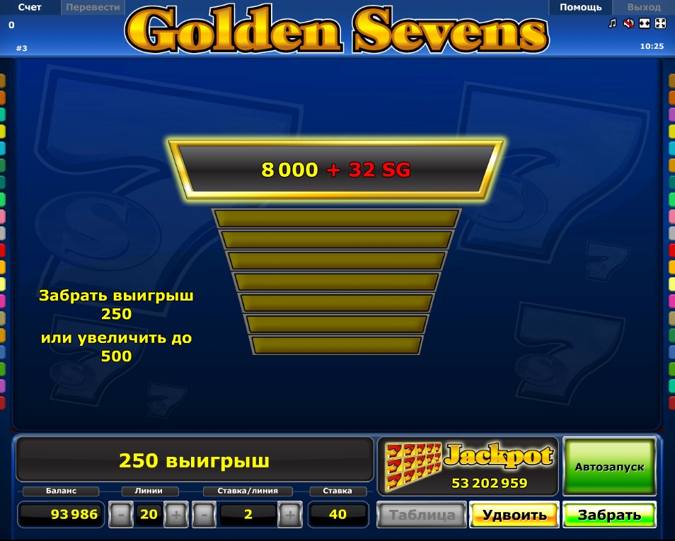 Общий выигрыш за раунд можно сразу перевести на пользовательский счет или поставить на кон в игре по шансам видео-слота Golden Sevens. Он заставит вас вспомнить о первых оффлайновых игровых автоматах, которые появились на территории бывших советских республик. В данном раунде от вас ничего не зависит. Вы просто играете, а компьютерная программа определяет, победили вы или нет. Если вам повезло, выплата удваивается, и вы, если хотите, можете перейти на следующий уровень и продолжать играть. Если не повезло, вы лишаетесь ставки. Для каждого такого раунда устанавливается лимит выигрыша.
