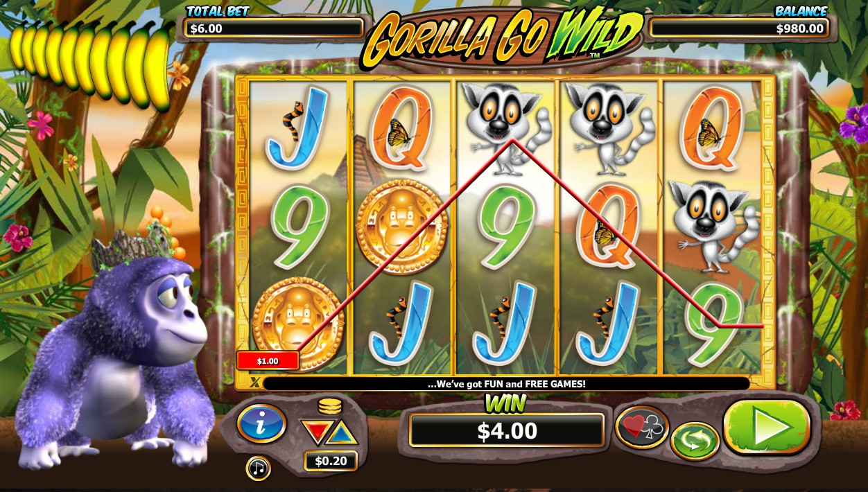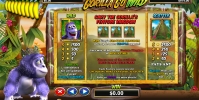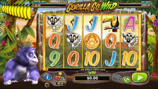 «Горилла слетела с катушек» - это слот-машина с пятью барабанами и двадцатью пятью постоянно задействованными линиями. Ставка принимается сразу на раунд, и она всегда равна тридцати монетам номиналом от двух центов до четырех долларов. Пять поставленных монет являются бонусными. Следовательно, на спин разрешается ставить от шестидесяти центов до ста двадцати долларов.