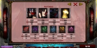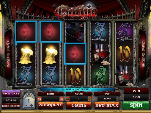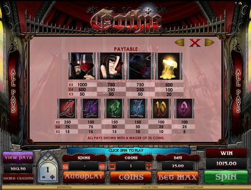 Играть на игровом автомате Gothic, имеющем пять барабанов, можно по одной – десяти монетам номиналом от одного цента до одного доллара. При этом ставка всегда кратна двадцати пяти. На спин принимается до двухсот пятидесяти долларов.